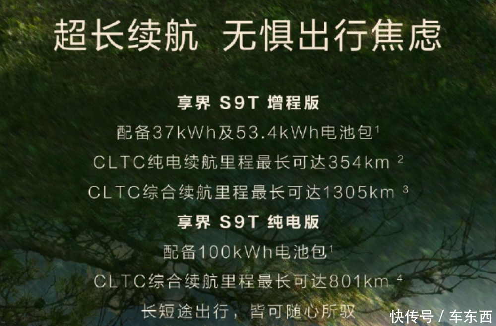 续航方面,享界S9T纯电版搭载容量为100kWh电池包,CLTC综合续航里程最长可达801km,增程版配备容量为37kWh电池包,CLTC纯电续航里程最长可达354km,CLTC综合续航里程最长可达1305km。
